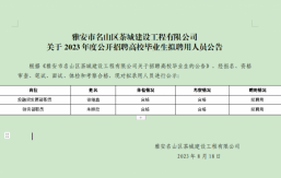 雅安市名山區(qū)茶城建設(shè)工程有限公司系雅安市名山區(qū)區(qū)屬一級(jí)國(guó)有企業(yè),成立于2018年,注冊(cè)資本2億元,主要經(jīng)營(yíng)范圍為對(duì)土地、城市資源等領(lǐng)域及保障性住房、房地產(chǎn)開(kāi)發(fā)、城市基礎(chǔ)設(shè)施、公共服務(wù)設(shè)施等進(jìn)行經(jīng)營(yíng)管理;并開(kāi)展項(xiàng)目投資、工程管理服務(wù)及園林綠化、環(huán)境治理、土地整理等各類(lèi)工程建設(shè)活動(dòng)。根據(jù)公司2022年人員招聘計(jì)劃,茶城公司及全資子公司擬面向社會(huì)公開(kāi)招聘高校畢業(yè)生3名(含2020年、2021年未就業(yè)高校畢業(yè)生和2022年應(yīng)屆高校畢業(yè)生。特別說(shuō)明:“未就業(yè)高校畢業(yè)生”需同時(shí)滿足以下條件:拿到畢業(yè)證和學(xué)位證;在規(guī)定擇業(yè)期內(nèi)沒(méi)有與任何單位簽訂任何形式的勞動(dòng)合同...